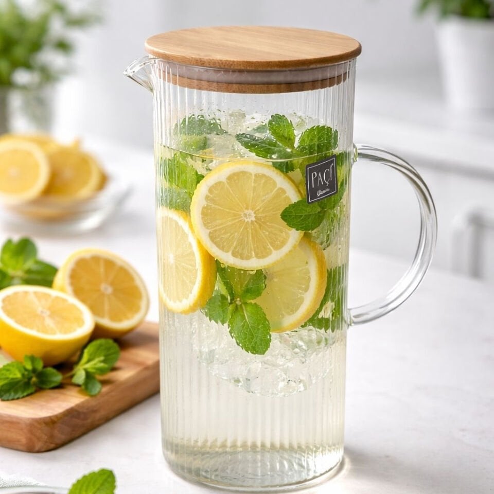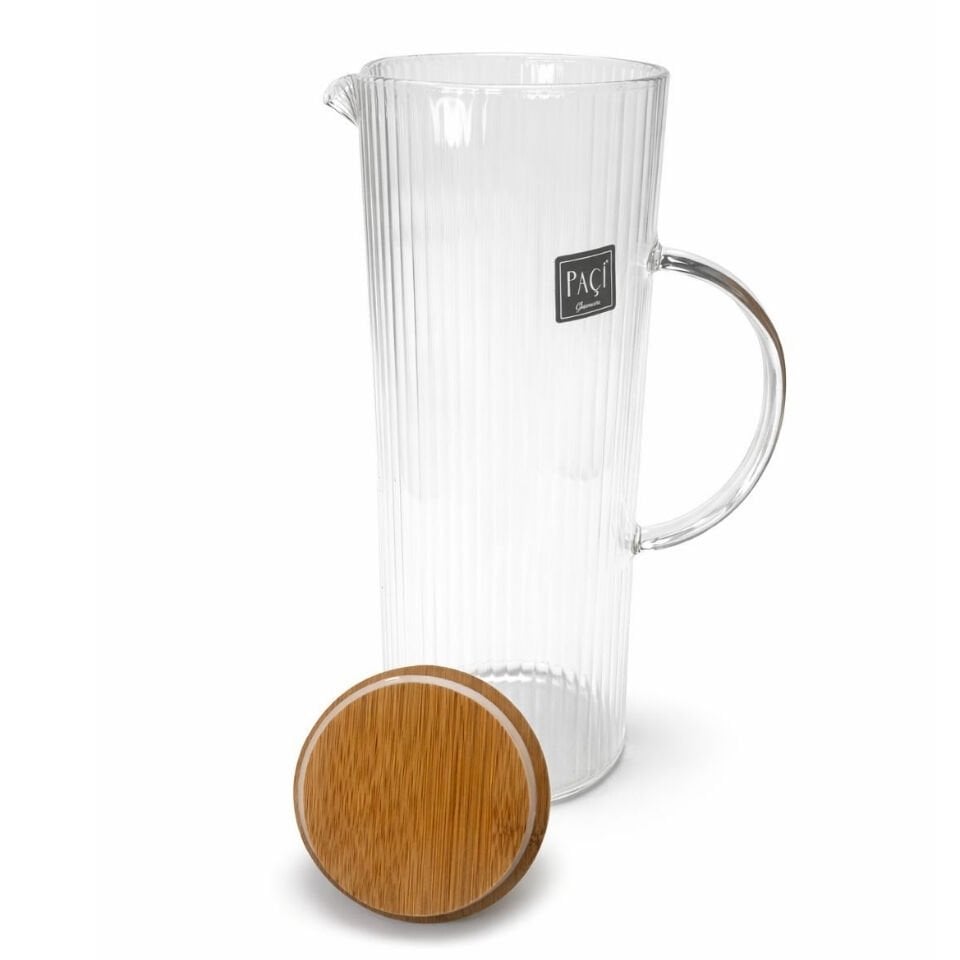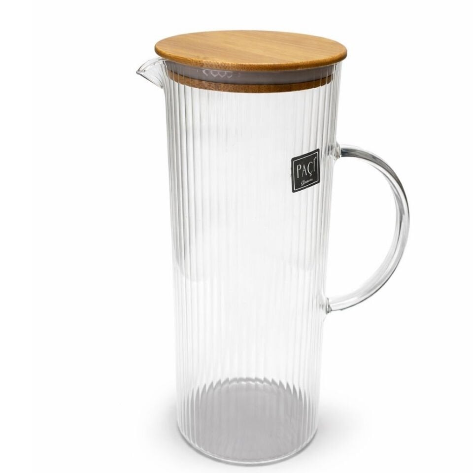 1500 ml Çizgili Cam Sürahi – Bambu Kapaklı Şeffaf Su & İçecek Sürahisi