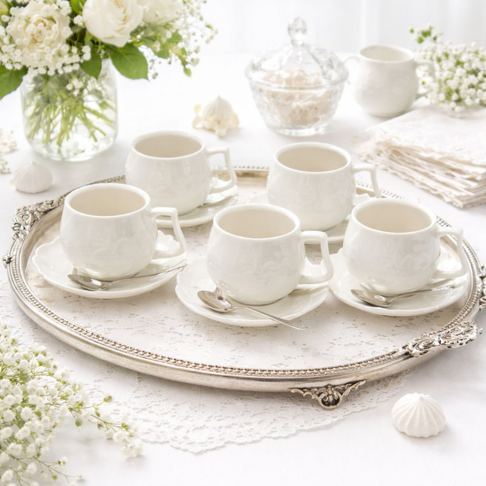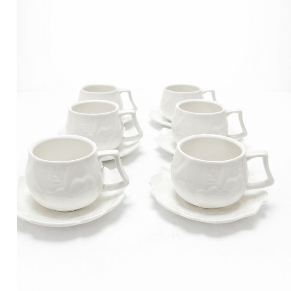 Zarif kabartma desenli tasarımıyla sofralarınıza şıklık katacak 6’lı porselen kahve fincanı takımı.