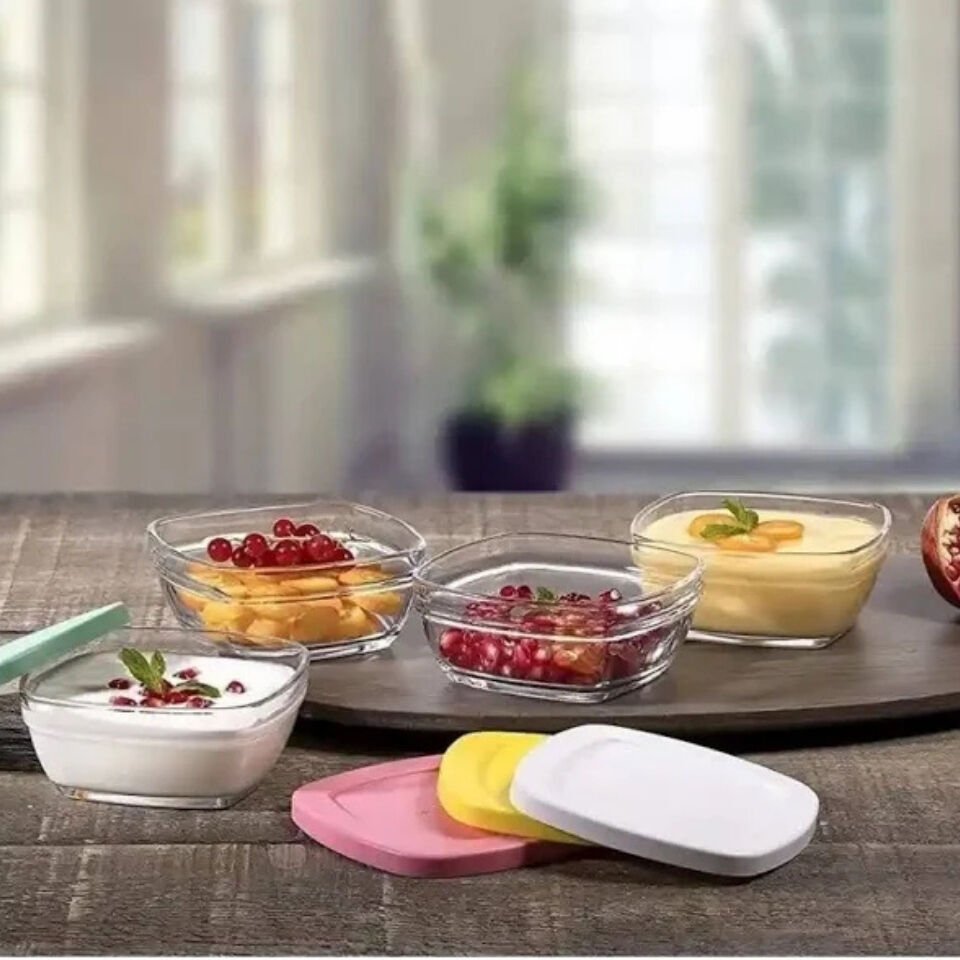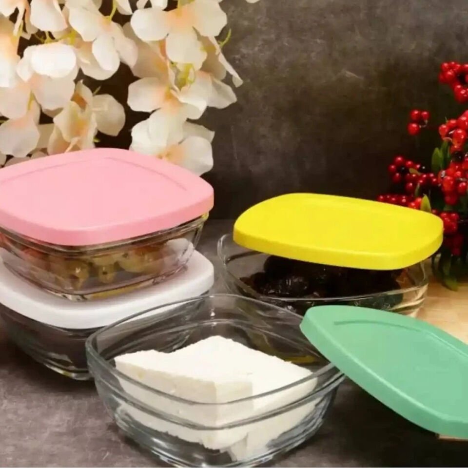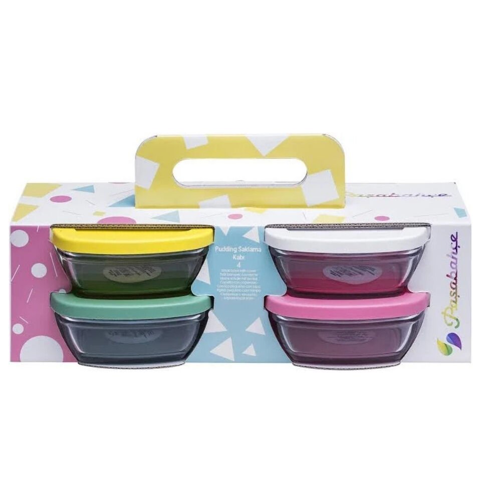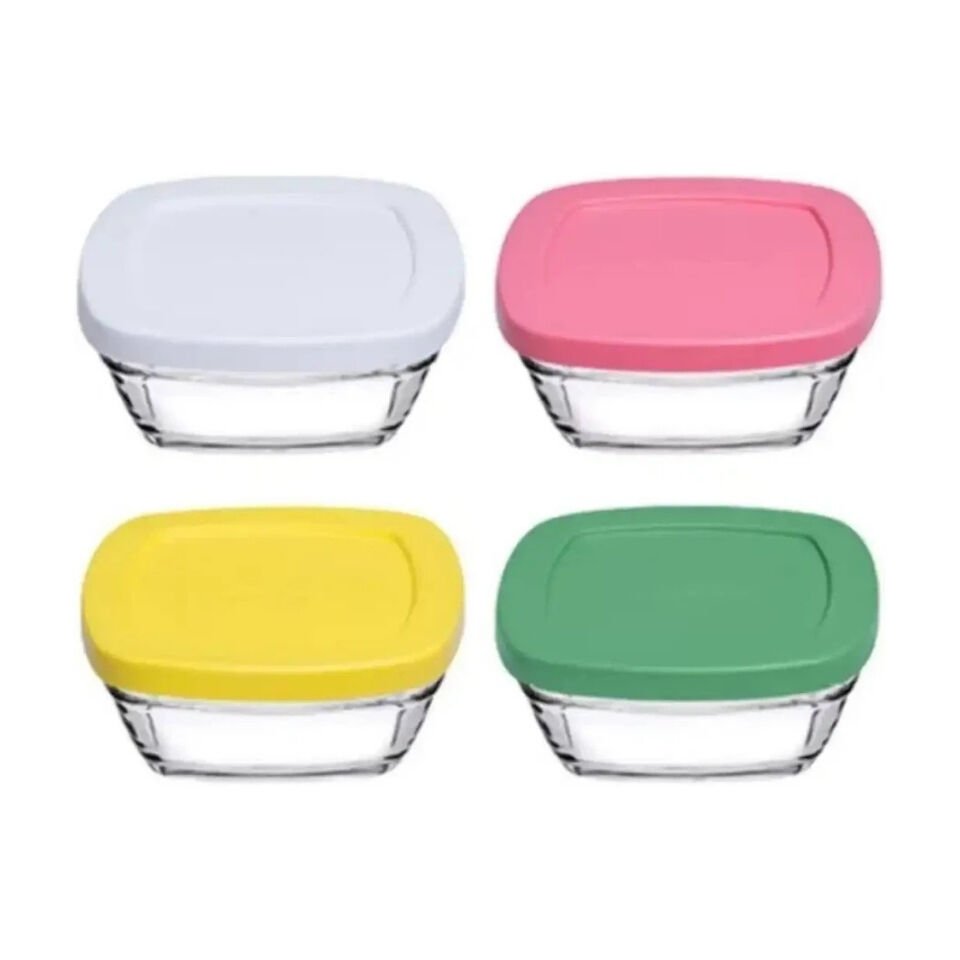 PAŞABAHÇE Cam Saklama Kabı Seti, 4 Parça, Asortili Çok Renkli Plastik Kapakli, 310 cc