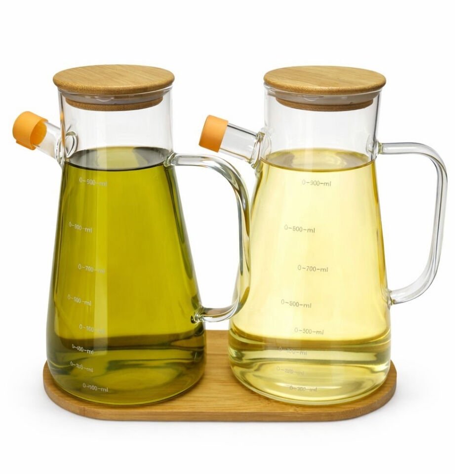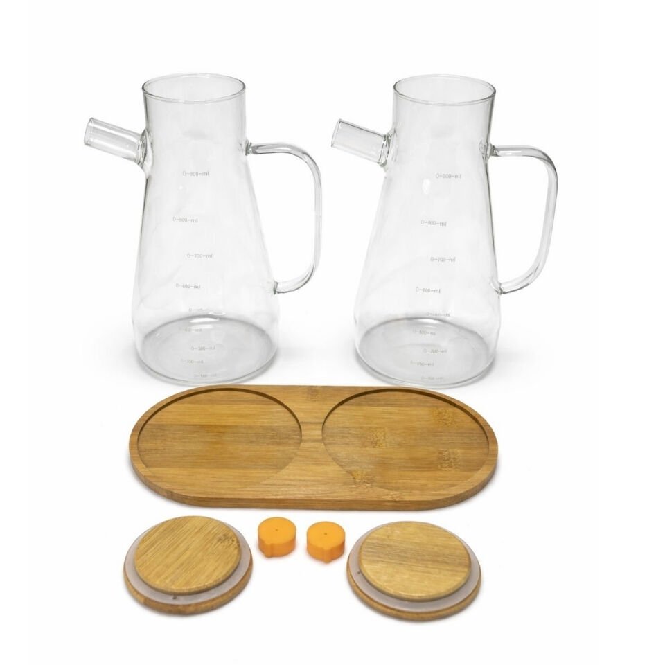 Premium 2’li Cam Yağdanlık Seti 900 ML – Ölçekli Borosilikat Cam, Bambu Kapak & Standlı, Damlatmaz Başlık