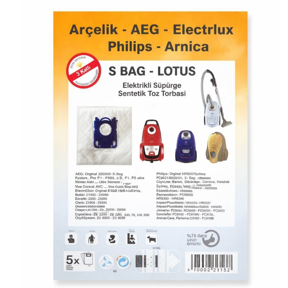 S Bag – Lotus 3 Katlı Sentetik Süpürge Toz Torbası (5’li Paket) | Arçelik, AEG, Electrolux, Philips, Arnica Uyumlu